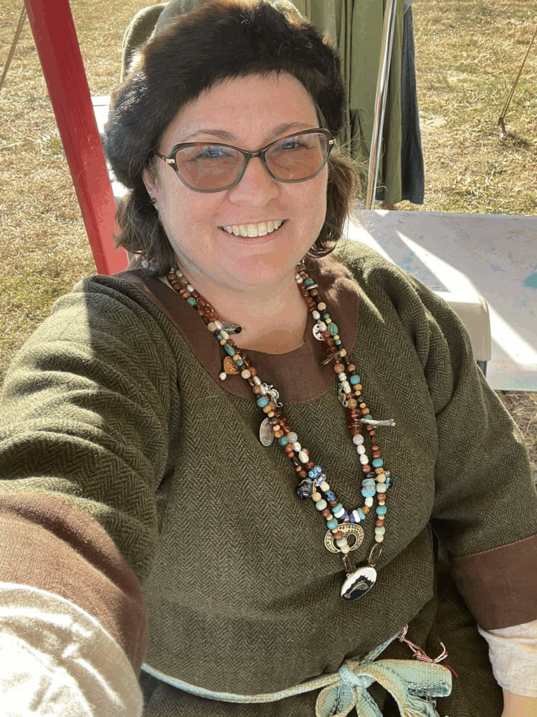 Finnebreth Wodeward lives in North Central Virginia and is Keeper of the Forest of Stierbach. She leads a monthly medieval hiking and outdoor skills group, the Stierbach Saunterers, and has been an intermittent member of the SCA since 2006 (only active since 2018). She lives with her family and various animals and is a bicycle and pedestrian planner in the outside world. In the Society Finnebreth is a minor noblewoman stewarding a forest holding in 14th century England, although she also “does” other periods, particularly Viking. She loves teaching, camping events, crafting stuff, and bringing people together. Finnebreth served as High Warden from October 2020 to March 2023; as a former High Warden, she serves on the Council of Wardens, advising and assisting the current High Warden.